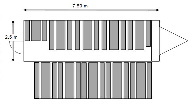 Ein Eingang am Heck, Gasheizung, Sitzbänke & Tische für 34 Personen, Tageslichtbeleuchtung.