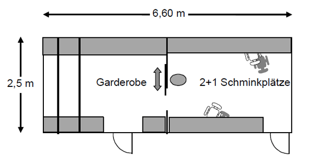 Maske: 2 vollwertige Schminkplätze +1 ZusatzSchminkplatz, Pumpstühle mit Nackenstütze, Rückwärtswaschbecken, Schubladen, Tageslichtbeleuchtung.